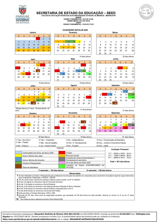 Calendário Escolar 2026 para o CAP-UEM, homologado e aprovado pela Secretaria de Estado da Educação do Estado do Paraná.